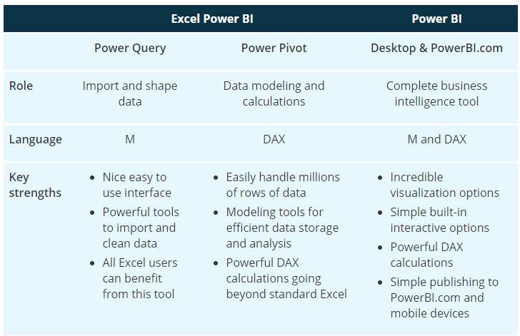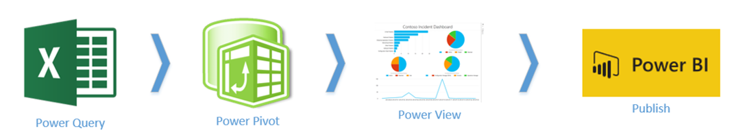 Power Query 에서 데이터와 연결하고 Power Pivot 을 통해 데이터를 정제한 뒤 Power BI 를 사용해서 리포트를 제작하고 Business 에서 활용합니다.