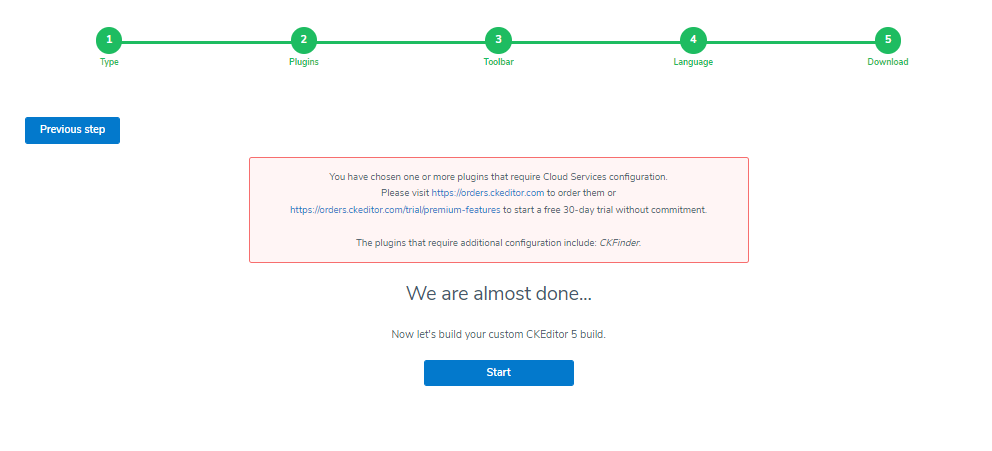 유료 플러그인이 포함된 경우 다음과 같이 경고 문구가 뜨기 때문에 구분이 가능하다. Start 를 눌러서 다운을 받으면 선택한 기능들이 포함된 Ckeditor JS 파일이 받아지게 되고 각 페이지에 적용하면 된다.