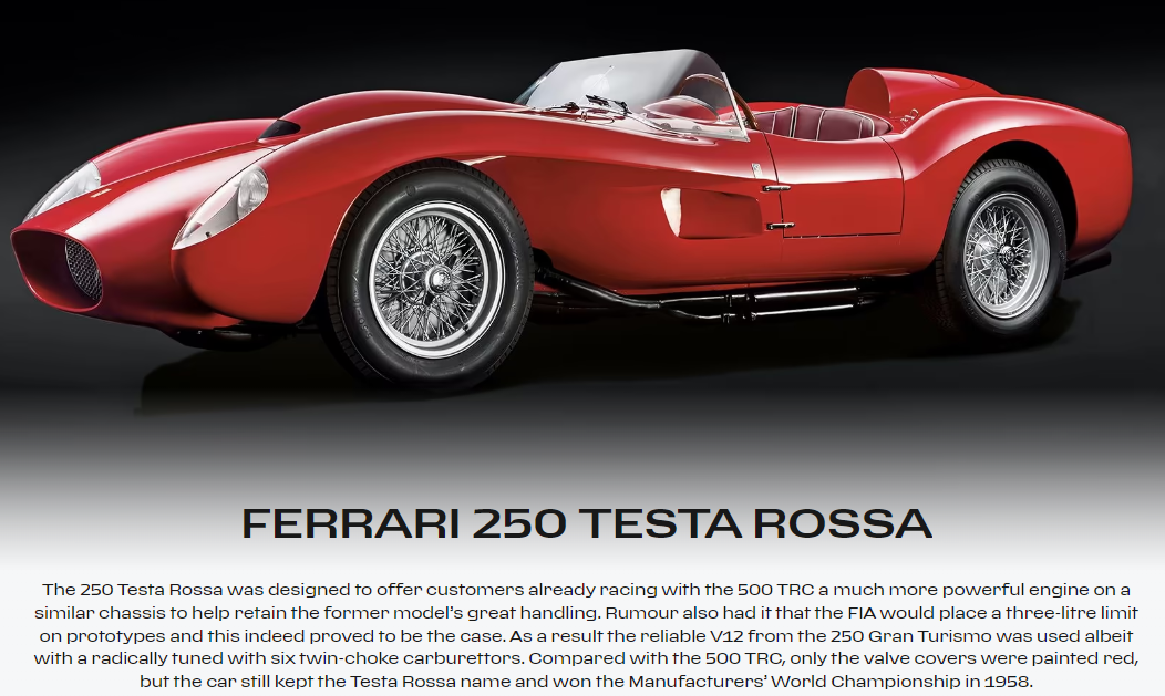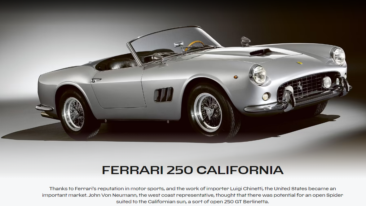 사진 출처 : https://www.ferrari.com/ko-KR/magazine/articles/celebrating-the-ferrari-250-gto, https://www.ferrari.com/en-EN/auto/250-testa-rossa, https://www.ferrari.com/en-EN/auto/250-gt-cabriolet, https://www.ferrari.com/en-EN/auto/250-lm, https://www.ferrari.com/en-EN/auto/250-california, https://www.ferrari.com/en-EN/auto/250-gt-2-2