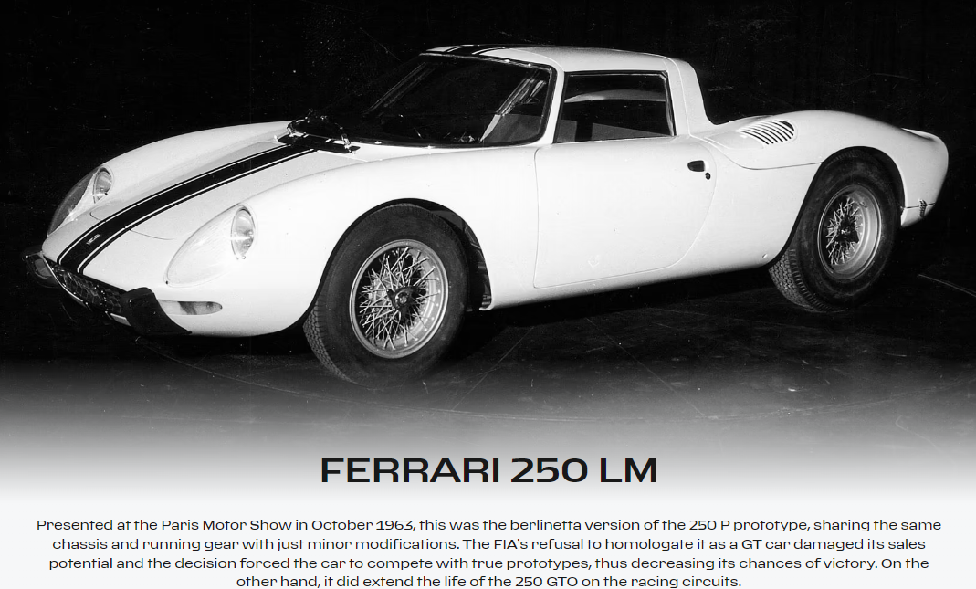 250 LM은 1963년부터 1966년까지 생산된 250 시리즈의 마지막 레이싱 모델로, 페라리 최초의 미드엔진 레이아웃을 채택한 레이싱카입니다. 이 혁신적인 디자인은 1965년 르망 24시간 레이스에서 페라리의 마지막 종합 우승을 안겨주었습니다. 250 LM의 성공은 이후 페라리의 레이싱카와 고성능 로드카 개발 방향에 큰 영향을 미쳤습니다.