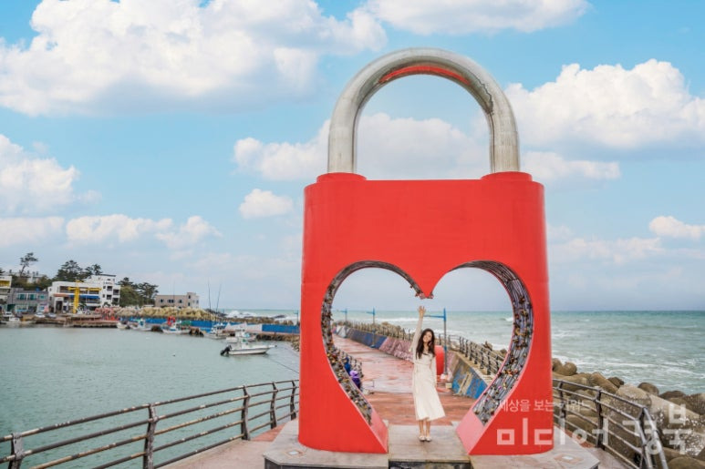 경주 양남면 하서항(일명 율포 진리항)에는 SNS에서 핫한 포토존이 있습니다. 바로 방파제 끝에 설치된 거대한 빨간색 자물쇠 모양의 조형물인데요. '사랑의 자물쇠' 포토존으로 불리는 이 조형물은 연인, 가족, 친구 간의 사랑과 우정을 기원하는 의미를 담고 있습니다.