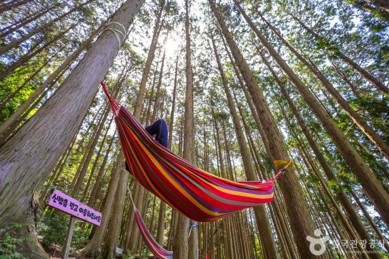 토피어리 정원 위쪽에는 울창한 편백숲이 있어 상쾌한 산책을 즐길 수 있습니다. 하늘 높이 솟은 편백나무들 사이로 난 오솔길을 걸으면 마음이 절로 편안해집니다. 숲 속 곳곳에 놓인 평상에서 소풍을 즐기거나, 아늑한 해먹에 누워 쉬어가는 것도 좋습니다. 푹신한 빈백에 몸을 맡기고 있으면 지친 몸과 마음이 절로 회복되는 듯합니다.