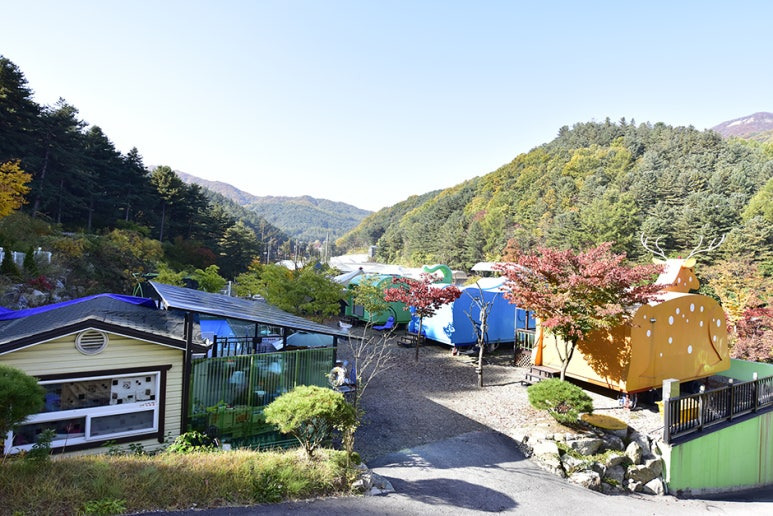 - 동물 모양 카라반: 4m×8m 크기로 3대가 있으며, 넓은 거실과 2층 침대, 샤워실이 구비되어 있어요.