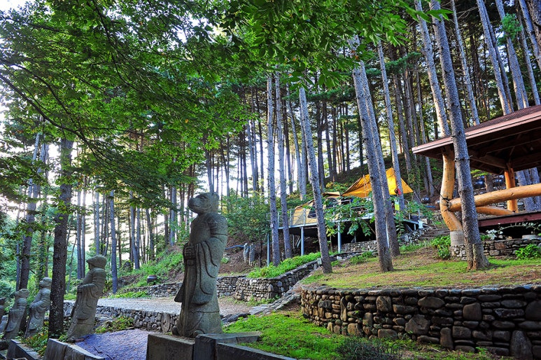 캠핑만으로는 부족하다고요? 걱정 마세요! 수목원 내에는 주제별로 꾸며진 정원과 다양한 조형물들이 있어 산책하는 재미가 쏠쏠해요. 또한, 맑고 수심이 얕은 계곡에서는 다슬기 잡기나 물놀이도 즐길 수 있답니다.