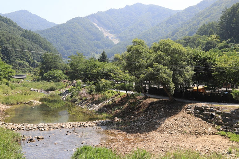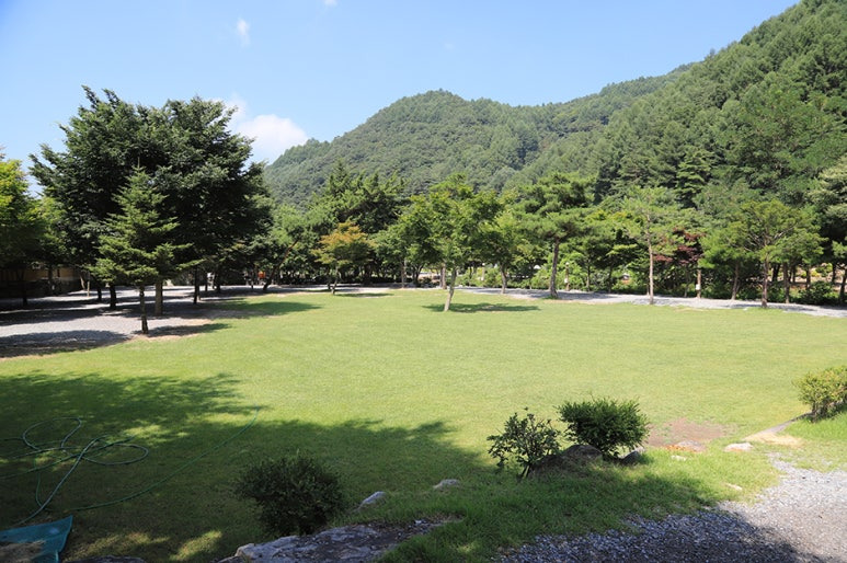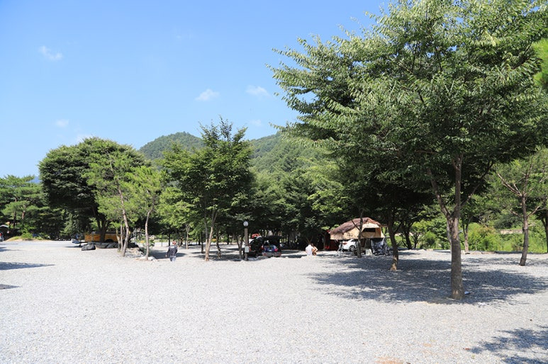 캠핑장 바로 옆에는 법흥계곡이 흐르고 있어요. 여름철 물놀이를 즐기기에 딱 좋은 환경이죠. 시원한 계곡물에 발을 담그고 더위를 식히는 것만으로도 여행의 피로가 싹 풀릴 거예요.