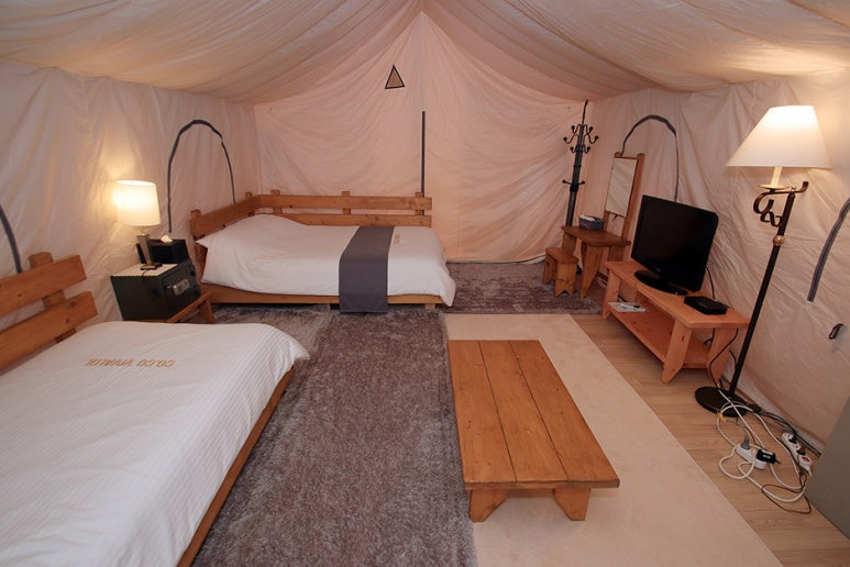 글램핑장은 더블룸, 트윈룸, 노블룸 등 3가지 타입의 19개 객실로 구성되어 있어요. 특히 노블룸은 다른 객실보다 넓고, 장작 화목난로와 개인 금고까지 갖추고 있답니다.